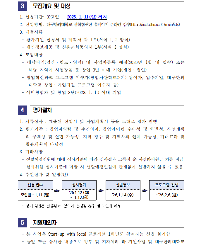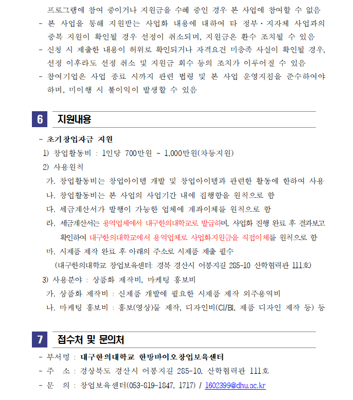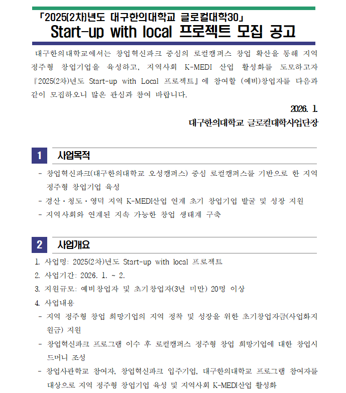 이전으로 2025(2차)년도 글로컬대학30 Start-up with local 프로젝트 모집 공고 지원분야사업화 창업단계 창업(1~3년) 기관명대구한의대학교 한방바이오창업보육센터 접수기간2026.01.06 ~ 2026.01.11 조회수9 붙임_2025(2차)년도 Start-up with Local 프로젝트 참여자 모집 공고문 및 신청서_2026.01.hwp 문의처 E-MAIL : TEL :
