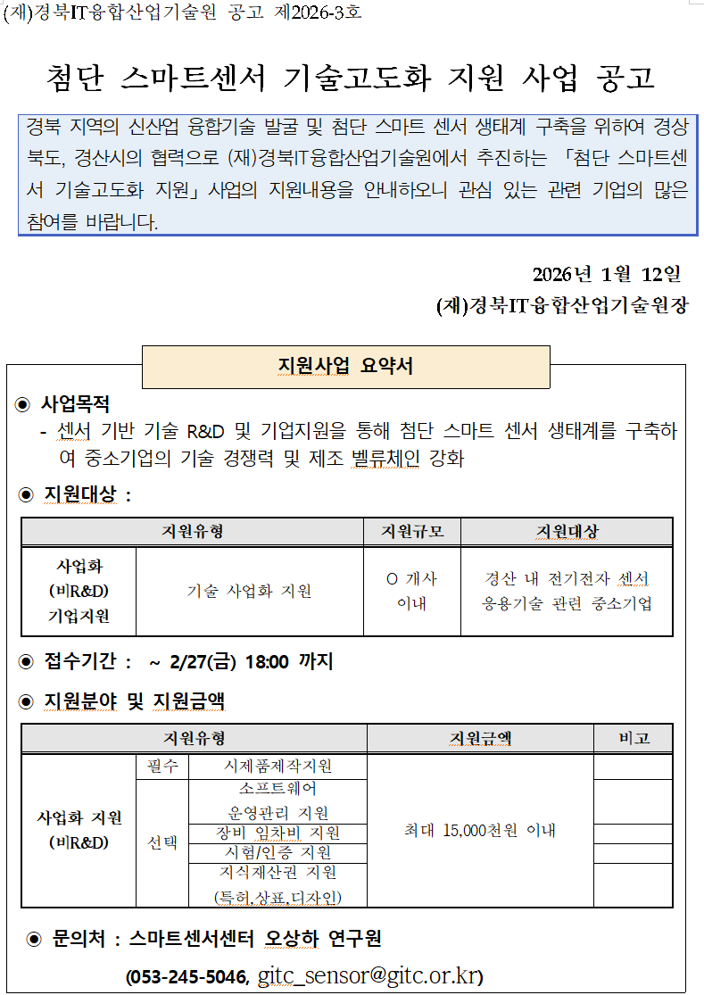 이전으로 2026년 첨단 스마트센서 기술고도화 지원 사업 공고 지원분야사업화 창업단계 창업(1~3년) 기관명경북IT융합산업기술원 접수기간2026.01.12 ~ 2026.02.27 조회수27 붙임1. 2026년 첨단 스마트센서 기술고도화 지원사업_공고문.hwp 붙임2. 2026년 첨단 스마트센서 기술고도화 지원사업_양식.zip 문의처 E-MAIL : TEL :